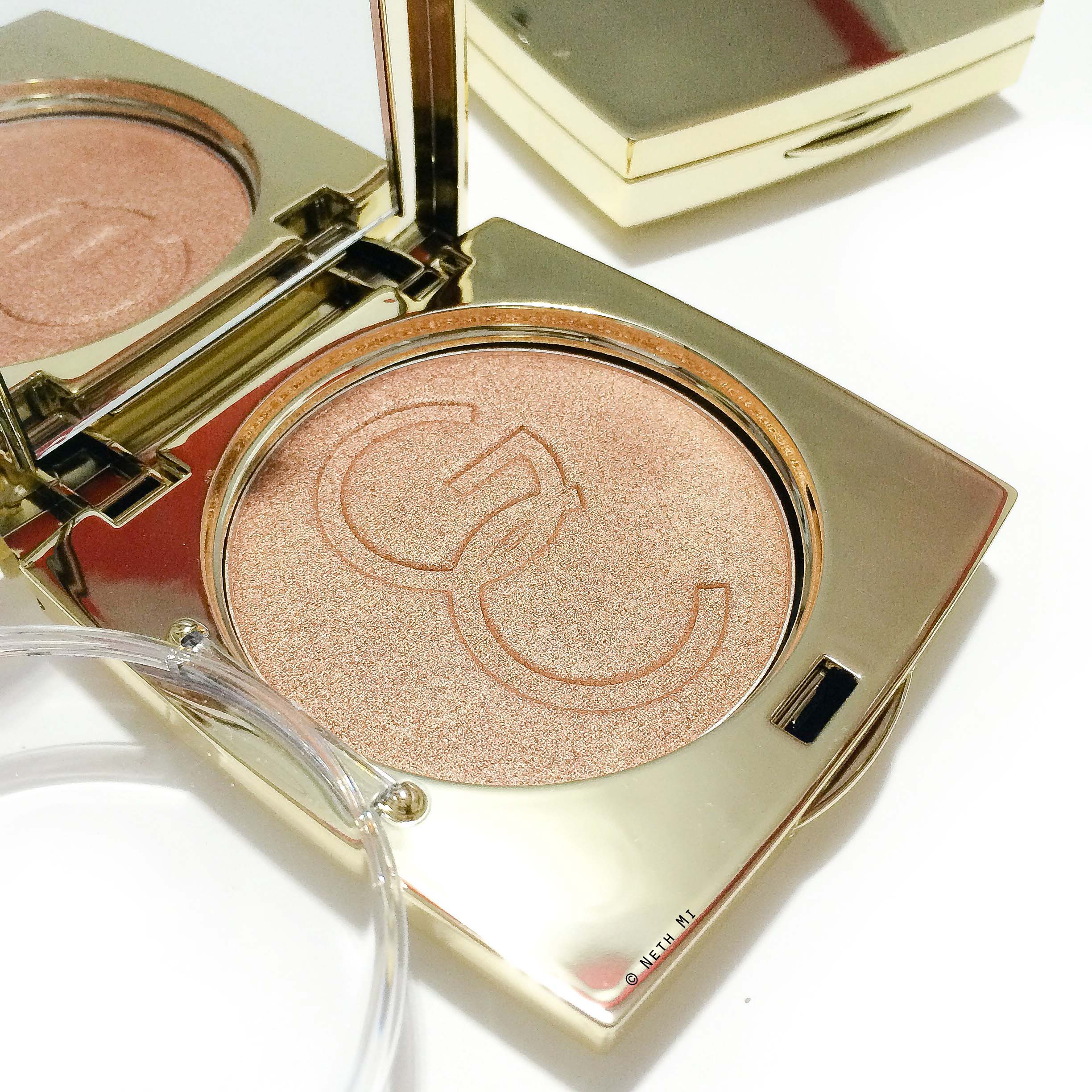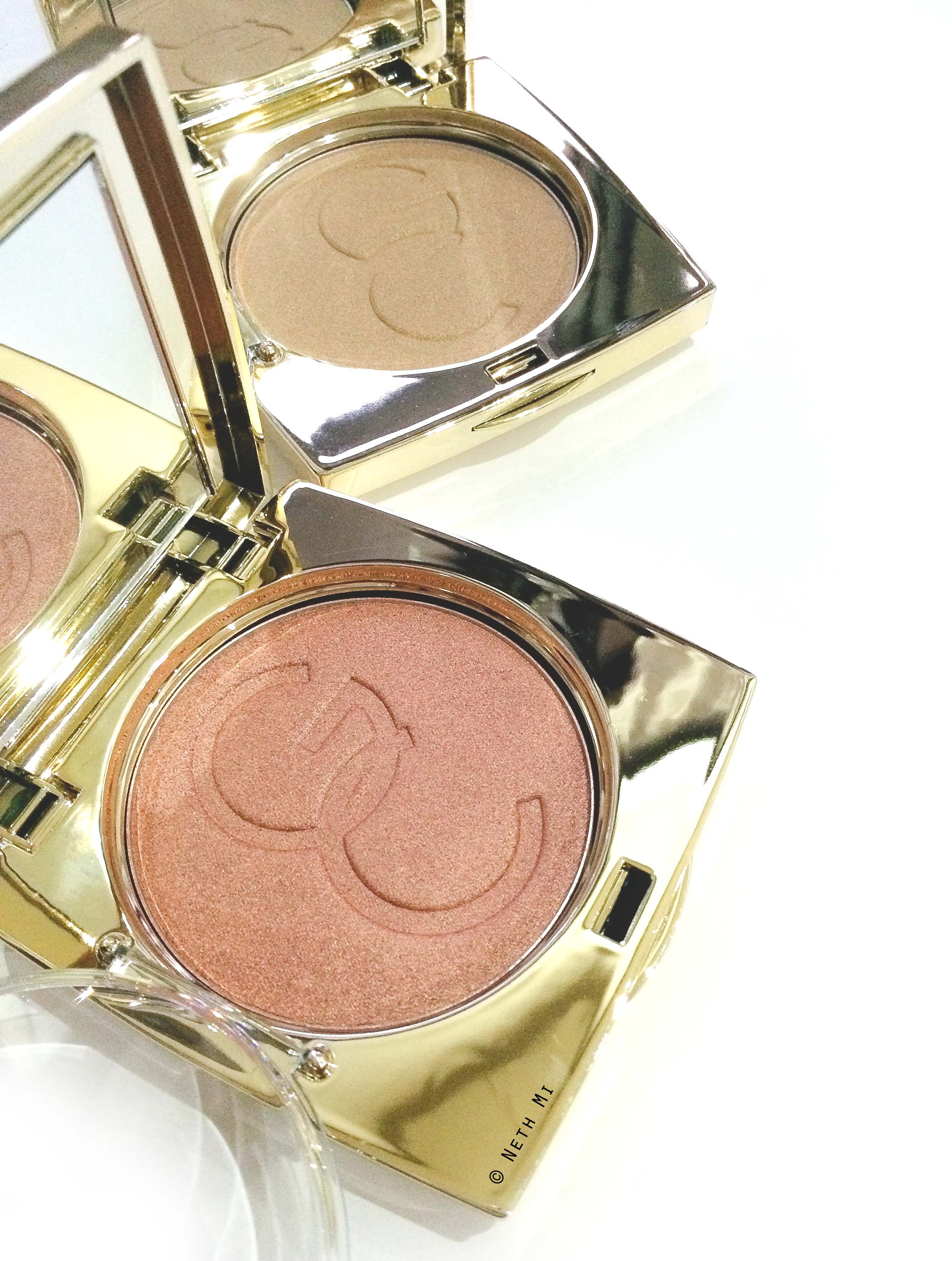 The actual container is:Â A beautiful gold box (which gets scratched, though) and it is also quite lightweight. What I love about them is that they have a second transparent lid-kind-of-protector (attached to the pan so you won’t lose it) so that the highlight powders won’t dust everywhere.