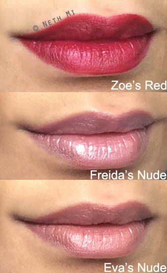 Overall performance of each lipstick was satisfying.Β Zoe’s Red stayed close to 5 hours before fading out evenly. Freida and Eva’s Nudes stayed about 3 hours so you’ll need some retouching throughout the day.