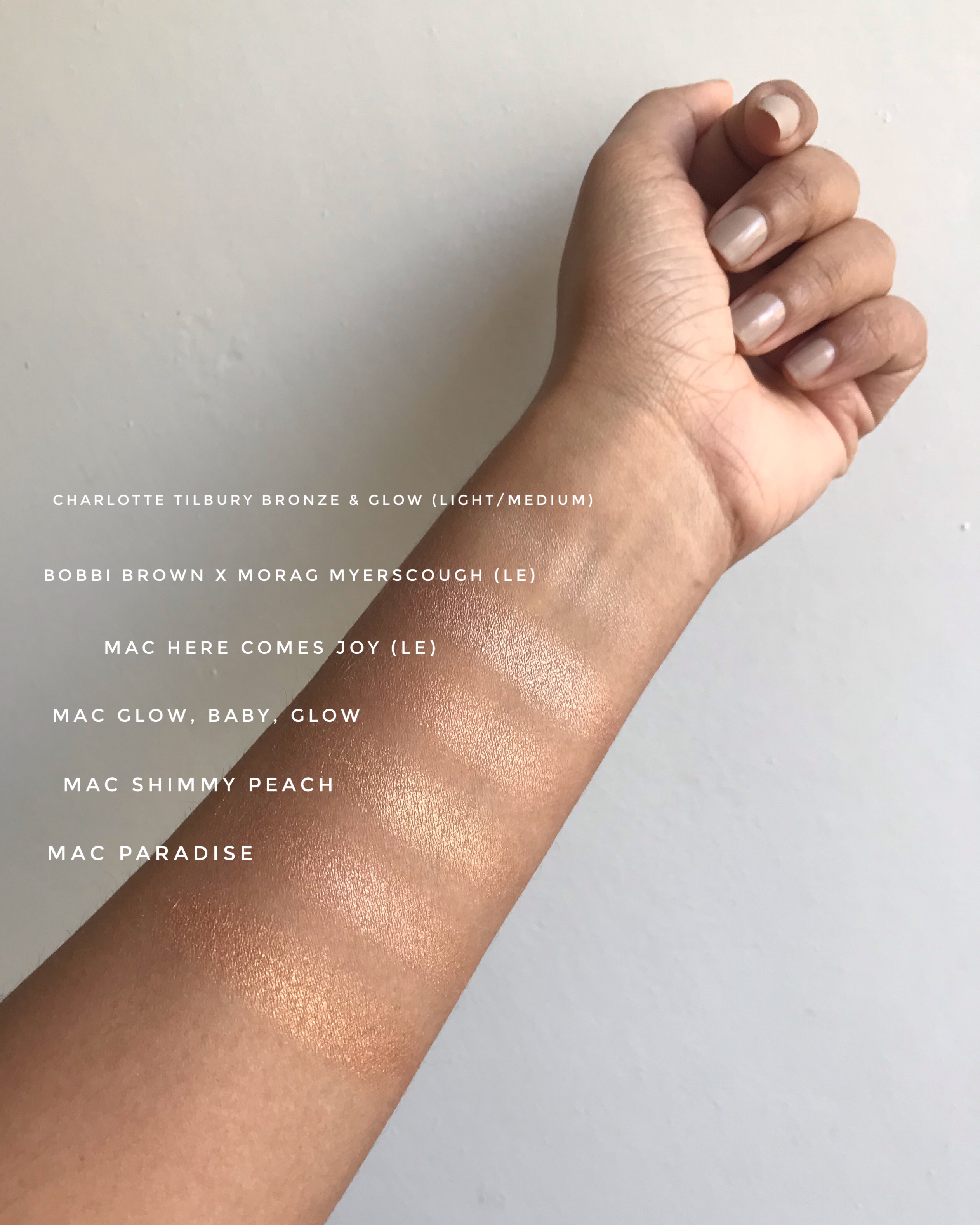 It tends to look slightly more metallic, but on the cheeks it gives you a lovely dewy glow! It compares well with the MAC Hyper Real Glow highlighters (the last three on the bottom) in terms of the finish.